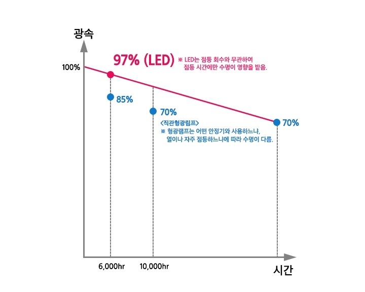 26W Çü±¤·¥ÇÁ ´ëºñ ÃÖ´ë 62%±îÁö ¿¡³ÊÁö Àý°¨ÀÌ °¡´ÉÇϰí, (»ï¼º LED ´Ù¿î¶óÀÌÆ®´Â ±âÁ¸ Çü±¤·¥ÇÁ 26W~52W±îÁö ´ëü) ¿ì¼öÇÑ »ï¼ºÀüÀÚ LED Chip ±¤¿øÀ» Àû¿ëÇÏ¿© 50,000½Ã°£ ÀÌ»ó º¯ÇÔ¾øÀÌ ¿À·¡¿À·¡ »ç¿ëÇÒ ¼ö ÀÖ½À´Ï´Ù.