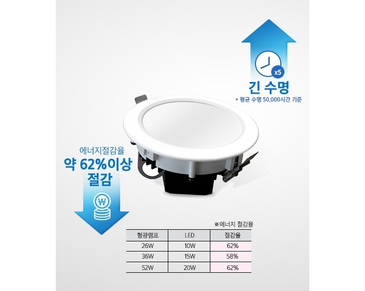 26W Çü±¤·¥ÇÁ ´ëºñ ÃÖ´ë 62%±îÁö ¿¡³ÊÁö Àý°¨ÀÌ °¡´ÉÇϰí, (»ï¼º LED ´Ù¿î¶óÀÌÆ®´Â ±âÁ¸ Çü±¤·¥ÇÁ 26W~52W±îÁö ´ëü) ¿ì¼öÇÑ »ï¼ºÀüÀÚ LED Chip ±¤¿øÀ» Àû¿ëÇÏ¿© 50,000½Ã°£ ÀÌ»ó º¯ÇÔ¾øÀÌ ¿À·¡¿À·¡ »ç¿ëÇÒ ¼ö ÀÖ½À´Ï´Ù.
